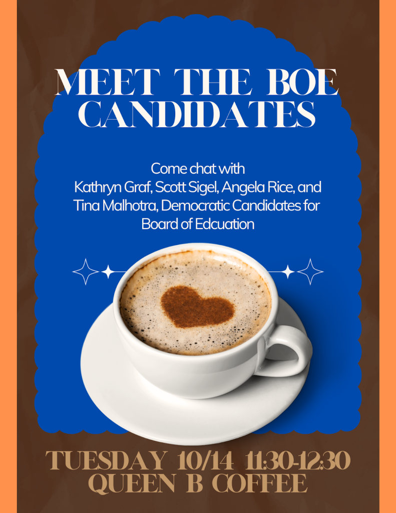 Come chat with Kathryn Graf, Scott Sigel, Angela Rice, and Tina Malhotra, Democratic Candidates for Board of Education!